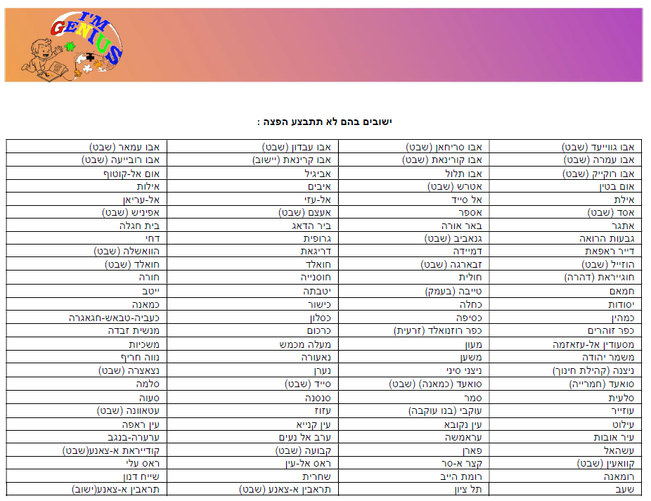 5.2. אספקת המוצרים המודפסים תתבצע בארץ ישראל בלבד. רשימת היישובים אשר לא ניתן לבצע אליהם משלוח מאתר I’M GENIUS מפורטת בלינק הנ"ל.
